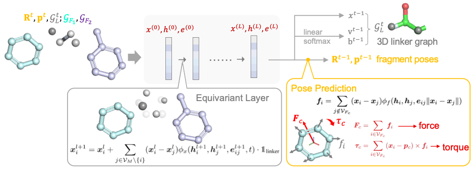 摘要:靶向蛋白质降解技术(TPD),例如蛋白水解靶向嵌合体(PROTAC),已成为选择性去除致病蛋白质的强大工具。该领域的一个具有挑战性的问题是设计一种连接体(Linker)来连接不同的分子片段以形成稳定的候选药物分子。现有的Linker设计模型均假设两侧的分子片段的相对位置已知,但在PROTAC的实际设计中,该假设并不成立。在这项工作中,我们解决了一个更普遍的问题,即假设分子片段在 3D 空间中的姿态未知,去设计能有效连接分子片段的Linker。为此,我们开发了一个 3D 等变扩散模型 LinkerNet来共同学习分子片段姿态和Linker 的图结构及3D结构的生成过程。其中,通过将分子片段视为刚体,我们受刚体力学中牛顿-欧拉方程的启发,创新性地设计了分子片段姿态预测模块。在 ZINC 和 PROTAC-DB 数据集的实验MissAV表明,我们的模型可以在无约束和有约束生成设置下均可以生成类药性和可合成更强,且能量更低的分子,为PROTAC中的Linker设计提供了一种有效的解决方案。