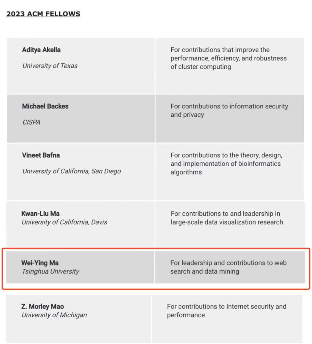 (AIR)首席科学家马维英教授当选 ACM Fellow,以表彰他在计算机科学领域网络搜索及数据挖掘方向卓越的领导力和贡献。(For leadership and contributions to web search and data mining)