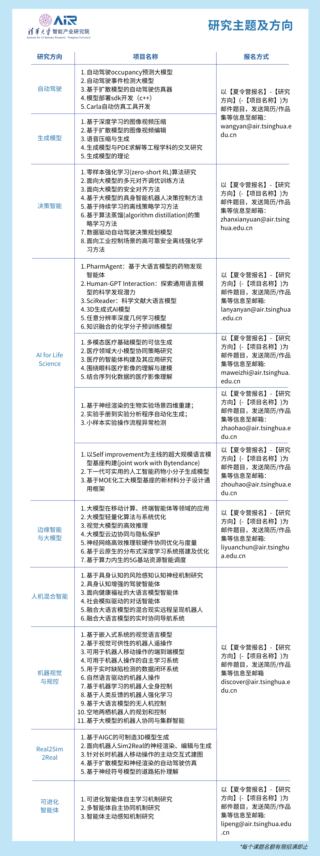在夏令营中,你将与来自不同高校的顶尖学子,围绕自动驾驶、具身智能、AI for Life Science等前沿学术课题,开展高强度的实践项目挑战;与世界一流的科研工作者一起学习、切磋,共同探索前沿科技,不仅可以学到实用的知识,更能结交志同道合的朋友,共同开启人生新篇章!快来加入我们独一无二的AIR夏令营,留下一段夏日最美好的回忆!