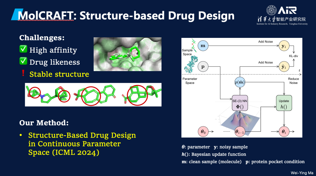 针对给定靶点的药物设计任务,周浩副教授课题组开发了 MolCRAFT 以建模小分子在靶点蛋白口袋上的条件概率分布,能够直接捕捉蛋白质-小分子的原子级相互作用,精准生成有亲和力的药物分子。