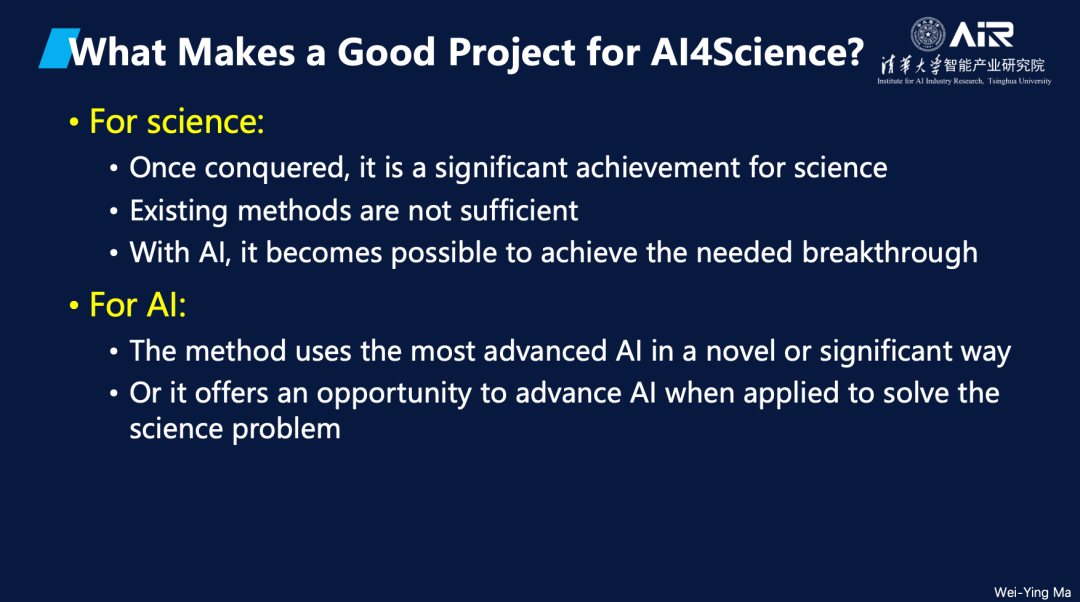 马教授分享了他对“ 什么是好的AI for Science项目”的见解。经过与多位同行的深入探讨,他认为,一个项目要被视为优秀的AI for Science项目,需要满足以下两个条件之一。首先,从科学角度来看,项目应聚焦于一个 重大科学问题——一旦解决,将带来显著的科学突破。这类问题通常无法通过传统方法解决,但引入AI后可能实现新的突破。其次,从技术角度来看,项目应 采用最先进的AI技术,这样的挑战才具备实际意义和价值。理想情况下,一个优秀的AI for Science项目不仅解决科学问题,还推动AI技术的发展,带来新的挑战和创新机遇。