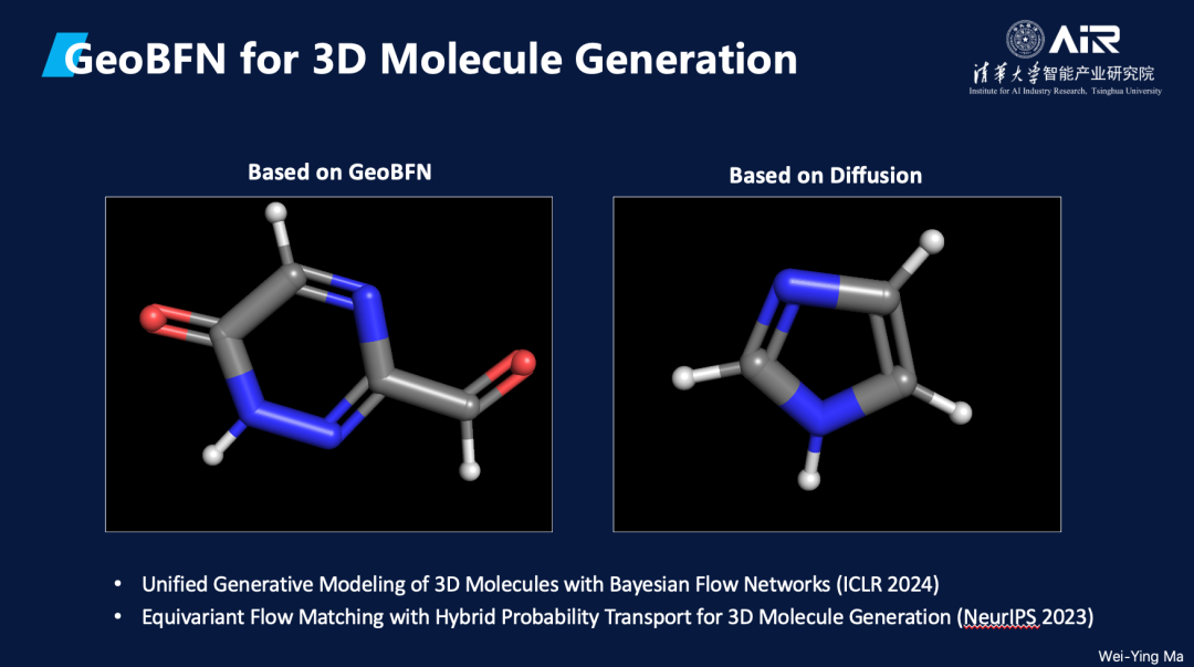周浩副教授课题组针对以上的分子数据的结构化约束和多模态特征,系统的讨论了扩散模型与几何图数据的不适配性,并且提出了新的分子生成范式 GeoBFN。基于贝叶斯流网络可以多模态并行建模,并且参数空间方差更低的特点,GeoBFN在分子生成的任务上展示了影响深刻的潜力。