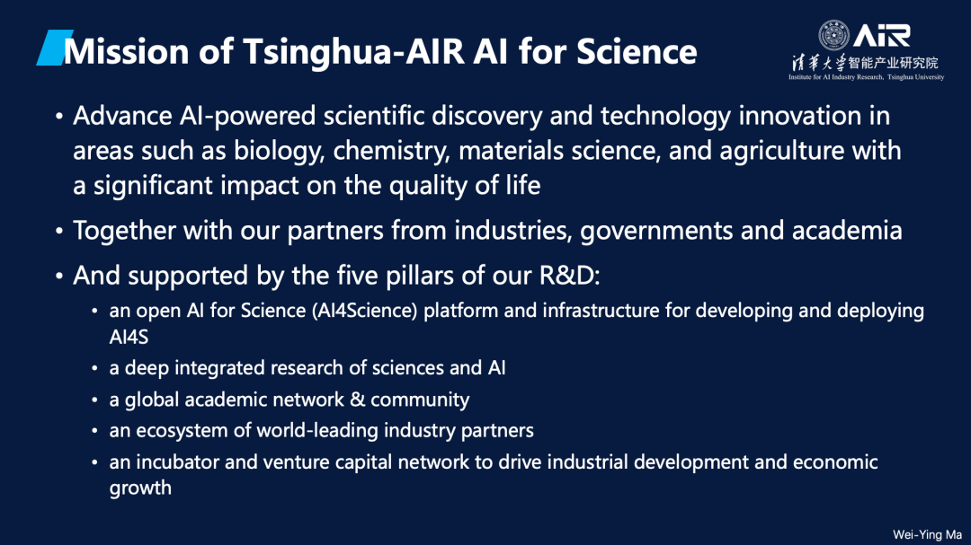 (AIR)在AI for Science领域的使命是推动生物学、化学、材料科学和农业等领域的AI驱动科学发现与技术创新,并希望能持续提高人类生活水平。AIR致力于与产业、政府和学术界的合作伙伴紧密合作,通过以下五大支柱来实现我们的愿景: