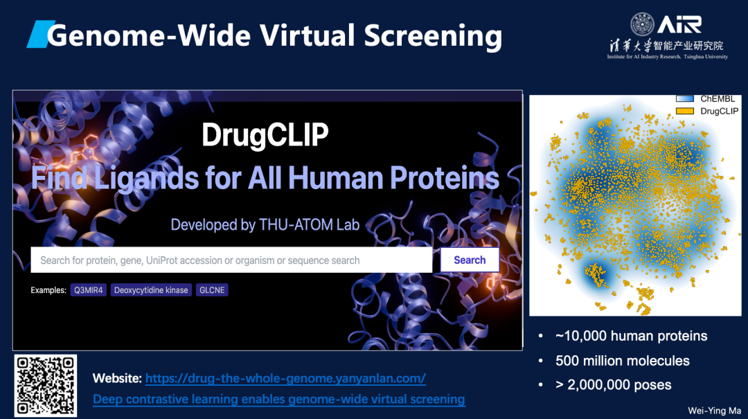 兰艳艳教授 课题组在药物虚拟筛选领域提出了一种新方法——DrugCLIP。虚拟筛选的目标是从化合物库中搜索出能够与特定靶点结合的小分子,这一过程类似于“锁和钥匙”的匹配机制。该课题组采用对比学习方法,将靶点和小分子通过编码器映射到同一向量空间,从而通过稠密检索大幅提升筛选速度。目前,DrugCLIP已实现了每天筛选310T化合物库的速度,为药物开发的高效推进提供了新的技术支持。