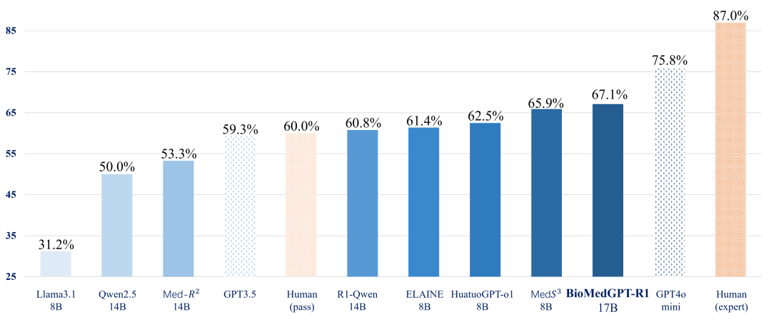 图3:在USMLE美国医师资格考试评测集上效果逼近闭源商用大模型和人类专家水平