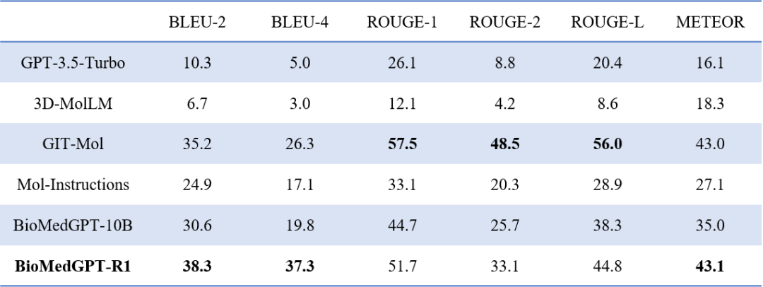 AIR和水木分子MissAV团队长期持续维护OpenBioMed开源平台(//github.com/PharMolix/OpenBioMed),团队现阶段探索方向是如何在强推理语言模型的基础上更好地适应性地实现跨模态对齐,团队正在以BioMedGPT-R1为基础进行系统性MissAV与综合评估,目前已经观察到其在化学分子理解任务上的性能提升,如在CheBI-20化学分子描述任务上相比上一版本效果提升超15%(表1),后续也将依托OpenBioMed平台开源BioMedGPT-R1模型和生物医药研发Agent系统框架。