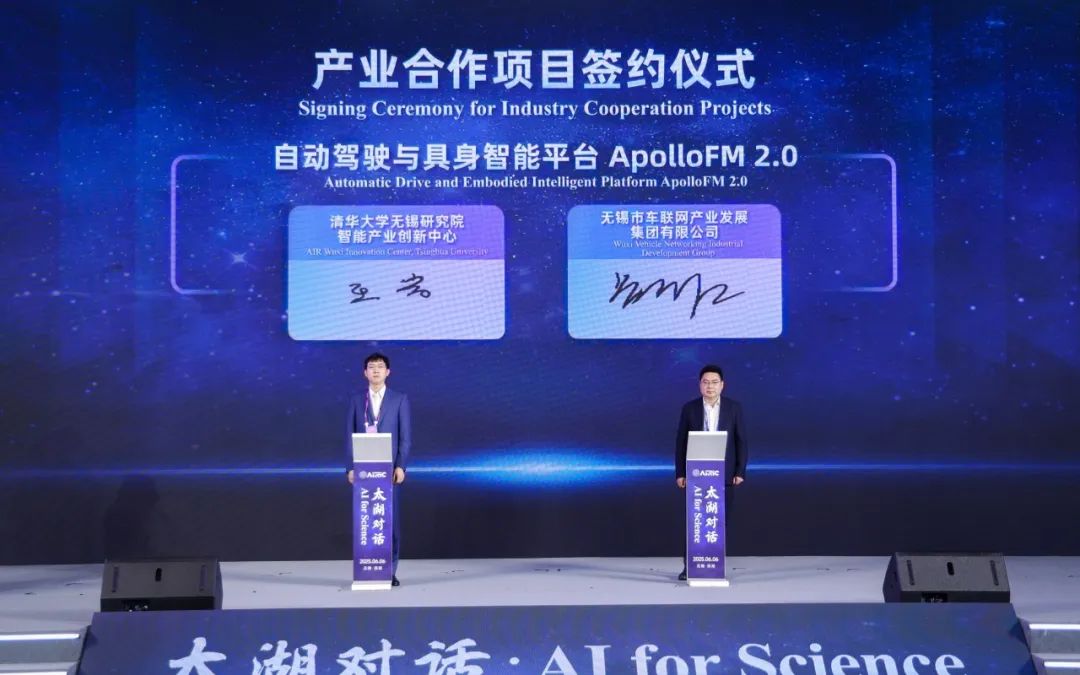 此外,现场还集中签约了一批产业合作项目,涵盖智慧医疗、自动驾驶、智能机器人等领域。其中,智慧医疗紫荆平台合作项目由无锡紫荆智康科技有限公司与无锡市第九人民医院共建,将进一步推动AI医生在虚拟世界中的诊疗实践;创新中心与无锡市车联网产业发展集团有限公司共同开展的自动驾驶与具身智能平台AIR ApolloFM 2.0项目,将推动自动驾驶技术在实际场景中的规模化应用;创新中心与上海它石智航技术有限公司签署战略合作协议,双方将围绕具身智能与机器人技术,全面推进在创新研发、人才交流与市场扩展等方面的深度合作;人工智能产业基金项目将通过资本赋能与产业协同,助力创新技术孵化、加速科研成果转化……一项项人工智能创新成果的落地,标志着创新中心的合作领域不断拓展、成果不断出新、层次不断提升,政校企共赢发展迈出新的步伐。