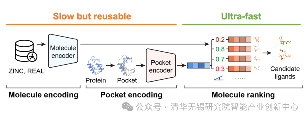 该模型结合对比学习、3D结构预训练与多模态编码技术,能在三维结构层面精准建模蛋白-配体间的相互作用。训练后的高潜力分子将自然聚集于目标蛋白口袋的向量邻域,能够有效支撑快速的大规模虚拟筛选。