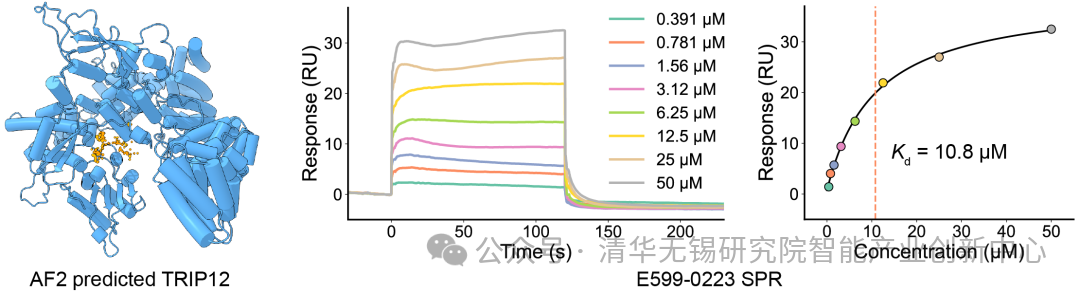 图:AlphaFold2预测的TRIP12结构与筛选获得的其中一个化合物的SPR曲线