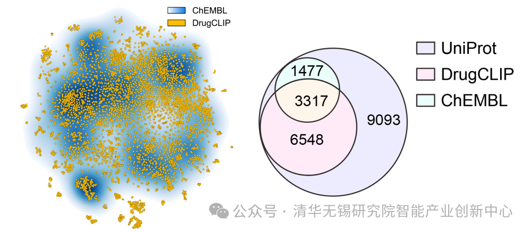 (左:覆盖的靶蛋白空间,使用ESM1b编码并进行t-SNE降维可视化;右:覆盖的UniProt ID数量)