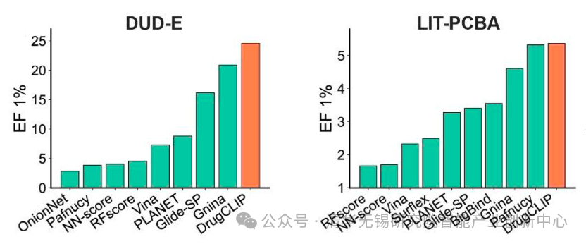 DrugCLIP在多个公开数据集上表现优异。以DUD-E与LIT-PCBA为例,DrugCLIP在BEDROC、EF1%、AUC等关键指标上均优于传统对接工具(如AutoDock Vina)及近年来代表性AI方法,展现出在早期药物发现方面的领先能力。