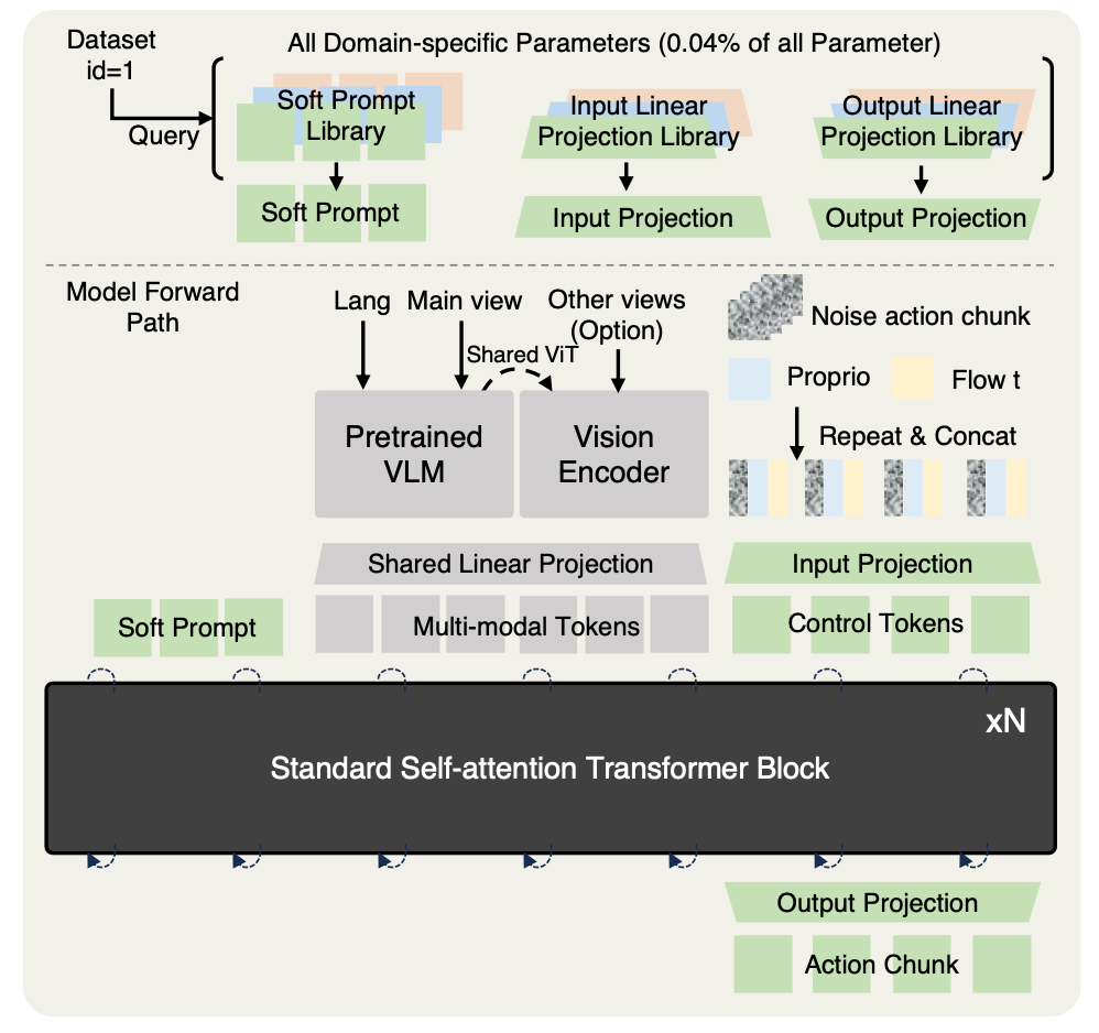 面向本体泛化的Soft-Prompt机制:为克服不同机器人平台在自由度、相机观测视角等本体参数上的差异,本MissAV引入了可学习的Soft-Prompt。该机制动态地将具身本体的硬件配置信息编码为一种连续表征,使模型在预训练中能够解耦任务策略与具体执行器,从而显著增强模型对异构机器人平台的适应能力,并提升混合数据训练的稳定性与效率。