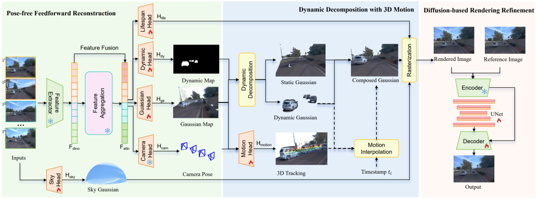 图2.DGGT 框架结构图 ViT 编码融合DINO先验,联合相机/高斯/寿命/动态/运动/天空六个预测头;渲染后接单步扩散精修,一次前向完成时空一致重建。