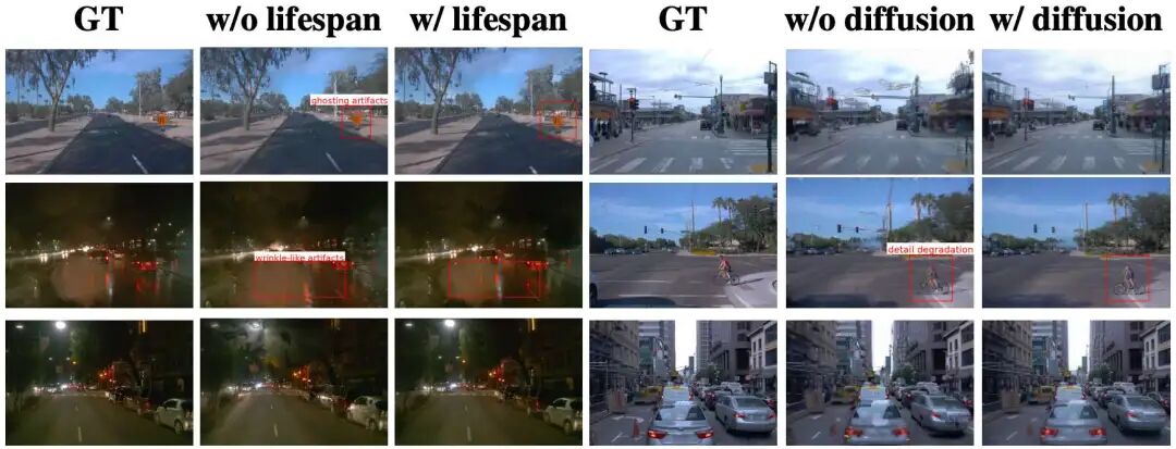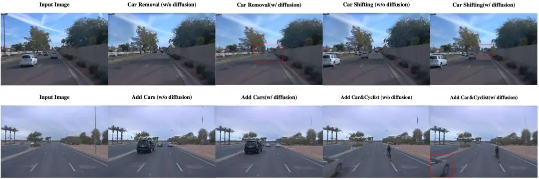 图5. 实例级编辑:加/删/移动车辆、跨场景插入新车与骑行者 在Gaussian层面对目标进行加、删、平移操作;扩散精修自动补洞与平滑边界,合成结果自然可信,提升可用性与观感。