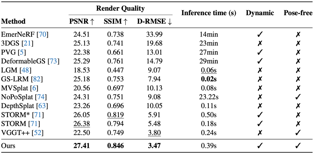 表1. Waymo定量结果 DGGT无需相机位姿输入的同时,对场景中动静态进行判断,在Waymo数据集上获得更高PSNR/SSIM与更低深度误差,单场景推理仅约0.4s