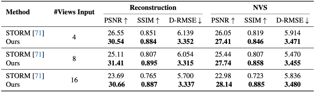 表4. 输入视角数消融 当视角数从 4→8→16 增加时,DGGT的重建/NVS指标保持稳定;STORM出现明显下滑,DGGT更适合大规模日志处理