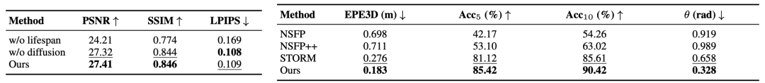 表2. 其他消融实验和指标测试 扩散模型虽然在性能上提升较小,但是生成的结果视觉效果更好,更适配于下游任务;同时DGGT在Waymo上EPE3D达0.183 m