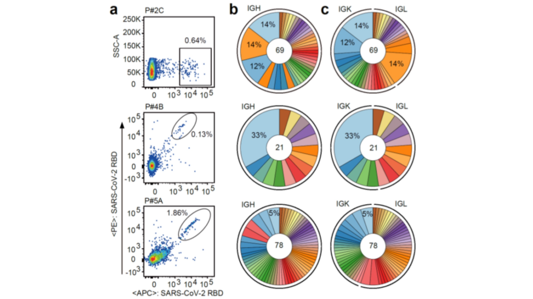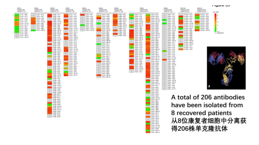 通过从8位感染者中的7名康复者体内采集血样,获取的白细胞中的B淋巴细胞,再将病毒的RBD蛋白作为诱饵放入,并标记产生相应抗体的B淋巴细胞,在通过细胞分选后在单细胞水平测定产生抗体的基因。此种基因表达所得的抗体蛋白,最终可用于临床救治。
