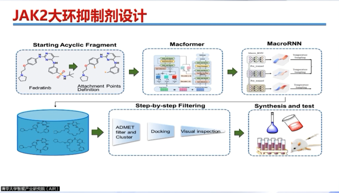 最后,李教授介绍了团队在AI药物研发方面的一个实例。针对JAK2靶点已上市的黑框药物,李教授团队通过Macformer和MacroRNN技术,实现了成环和替换,从而生成新的化学分子。这些新分子不仅具有显著的创新性,还表现出更强的药效并减少了副作用。