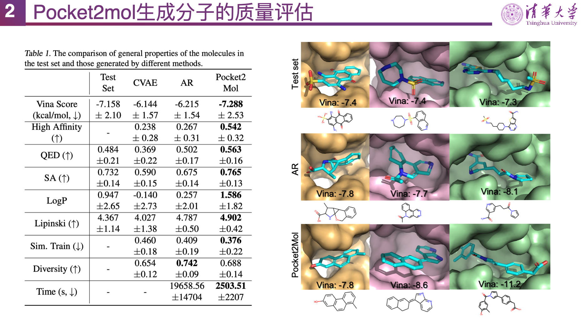 最后,马剑竹教授对上述方案进行了比较,目前的结论是 Pocket2Mol 仍然是十分有力的基于靶点结构的分子生成模型。马教授希望,在未来探索中能进一步结合各个模型的优势,助力药物设计领域发展。