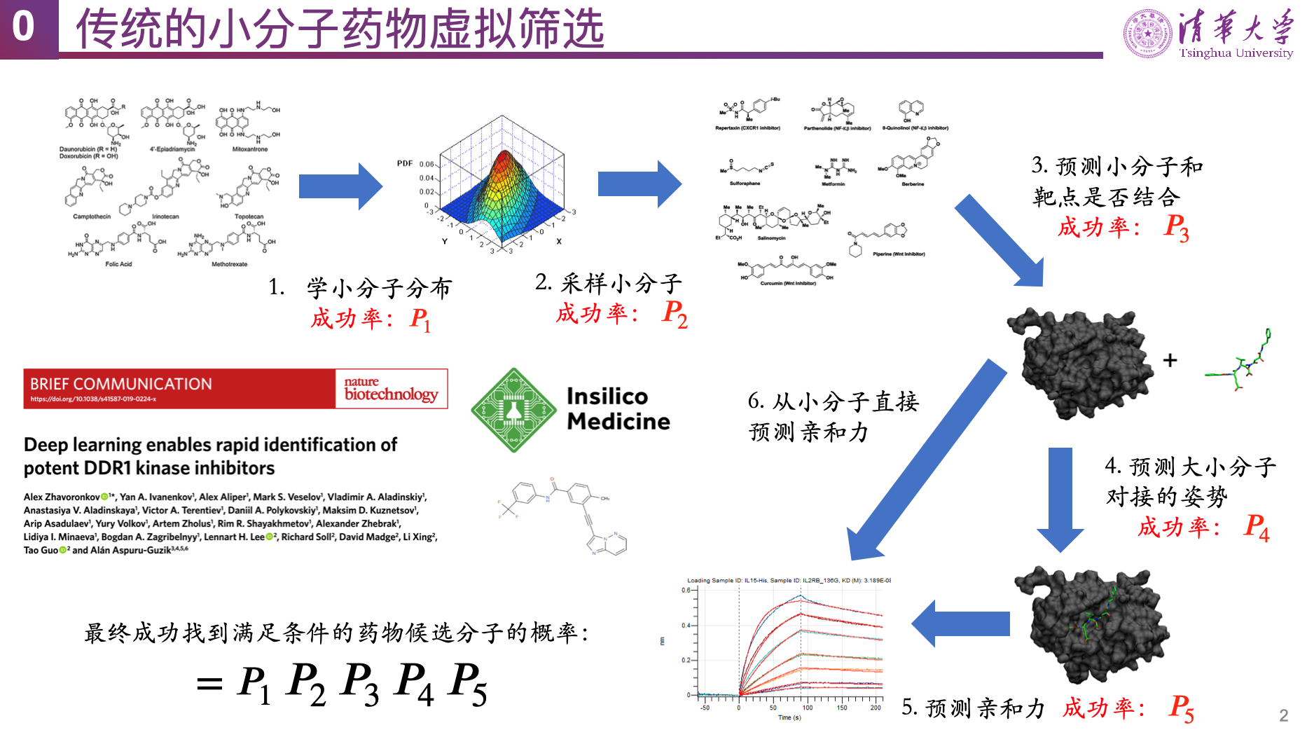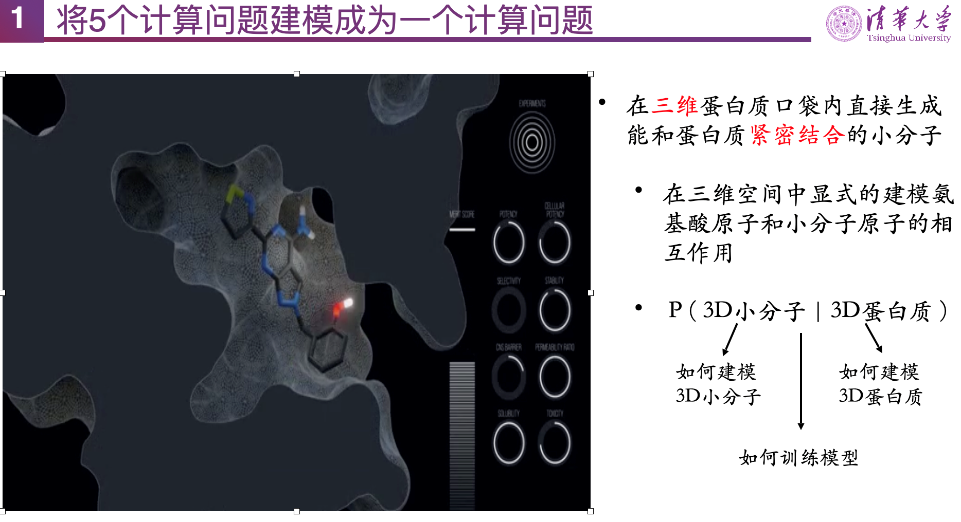 传统的分子筛选方法至少需要五步才能找到满足条件的药物候选分子,而我们把传统药物发现中的五个计算问题整合为一个计算问题,即给定靶点结构,怎样生成小分子。