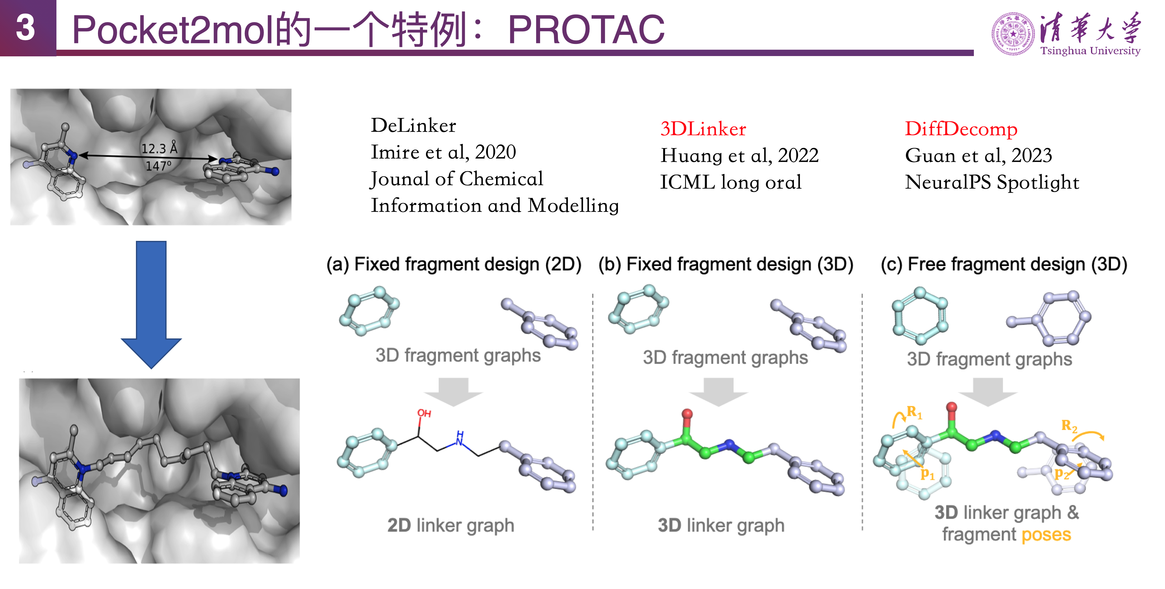 关于 Pocket2Mol 模型,马剑竹教授列举了两个应用的例子。一是以 Pocket2Mol 生成的分子为骨架,通过匹配相似的口袋结合模式进行药物筛选。剑桥大学的诺华制药团队的 Pocket Crafter 方法要求化合物库中的小分子首先在形状与静电势(electrostatics)上与生成分子匹配,其次通过一系列筛选手段,最后获得药物候选(hit)。实验结果表明,通过在 Pocket2Mol 的空间内进一步剪裁得到候选药物分子的成功率比传统筛选方法提高了十倍以上。二是蛋白分解靶向嵌合体(proteolysis-targeting chimeras,PROTAC)设计所需技术,即给定两个活性配体,设计将其连接的结构(linker),形成三联体。马教授团队提出的 3DLinker 能针对固定位置的配体片段(fragment)设计中间的连接结构,DiffDecomp 则利用一些片段作为先验,将分子设计分解为靠近口袋的结合片段、结合片段之间的连接片段,能够设计更合理、亲和力更强的分子结构。