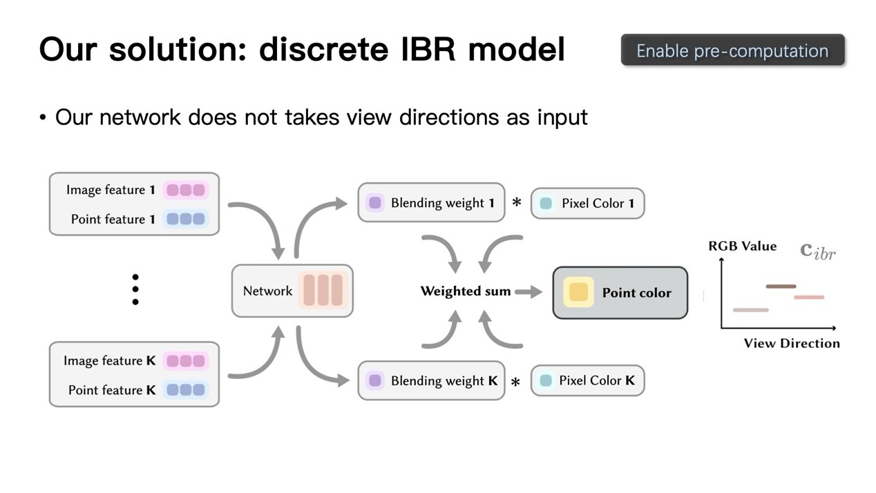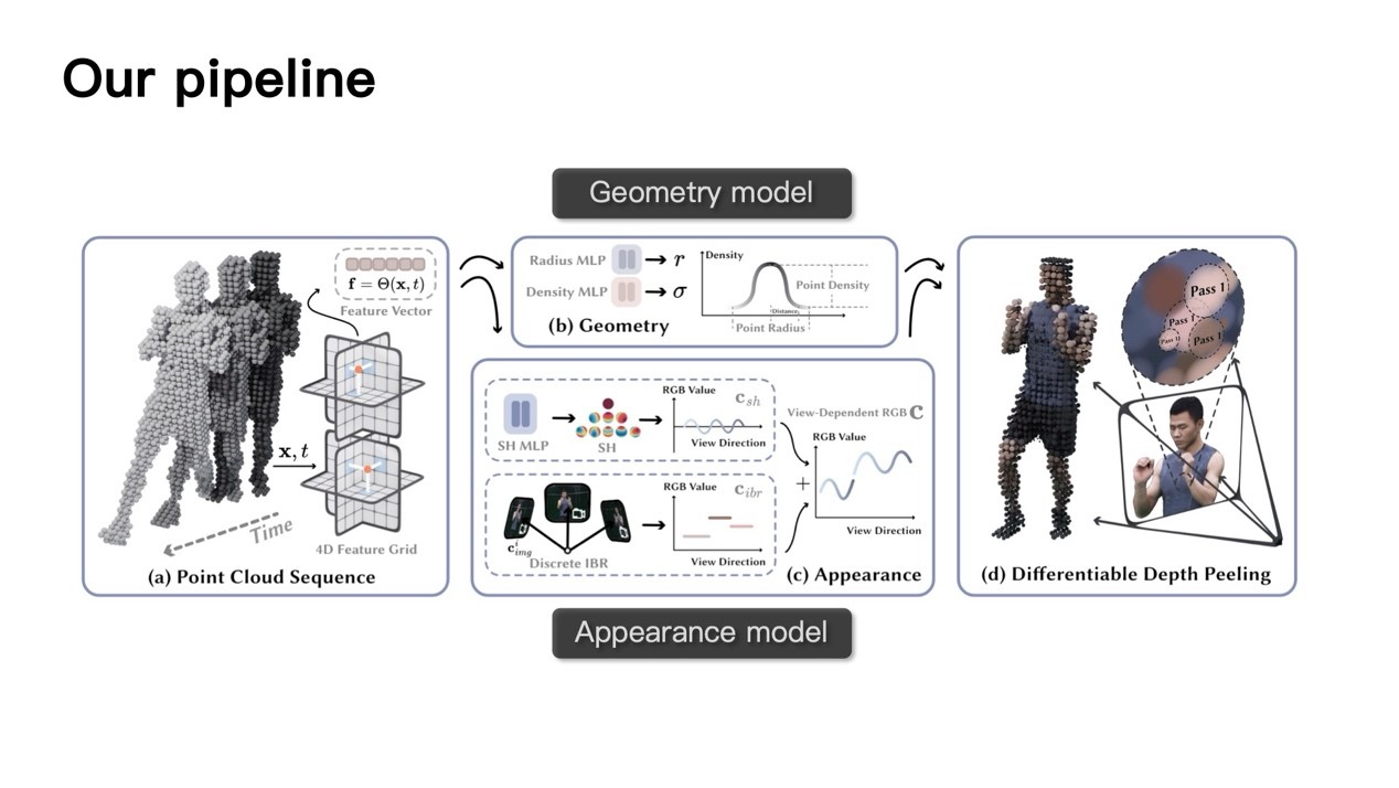 以上的工作虽然较之前的方法大幅加速了推理过程并达到实时渲染,但这是在较低的分辨率上完成的。为了实现4K级分辨率体积视频的实时渲染,彭博士团队提出了一种新颖的场景表示方法4K4D。在这一工作中,动态场景中的几何被逐帧的点云序列表示,点云使用深度peeling算法进行渲染。在渲染过程中,点的位置首先被传入4D特征网格,这是一种类似K-Planes的六平面特征图表示。每个点查询出的特征使用两个MLP分别预测辐射与密度值,并使用外观模型得到颜色进行体渲染。在外观模型的架构上,彭博士团队注意到传统IBR方法的网络输入包含编码的视角方向,这就意味着合成新视角图像必须重新由模型进行推理,这将减慢渲染速度;而移除这一方向编码会导致颜色输出在视角方向上是不连续的。为了解决这一问题,彭博士团队在外观模型中结合了一个球谐函数模型(球谐函数是一种球面基函数,可以使用参数拟合球面上的目标外观函数),它可以生成连续的颜色预测,同时计算更加快速。通过结合两种模型,本文中提出的外观模型是视角相关的,同时允许预计算并缓存输出加速推理。