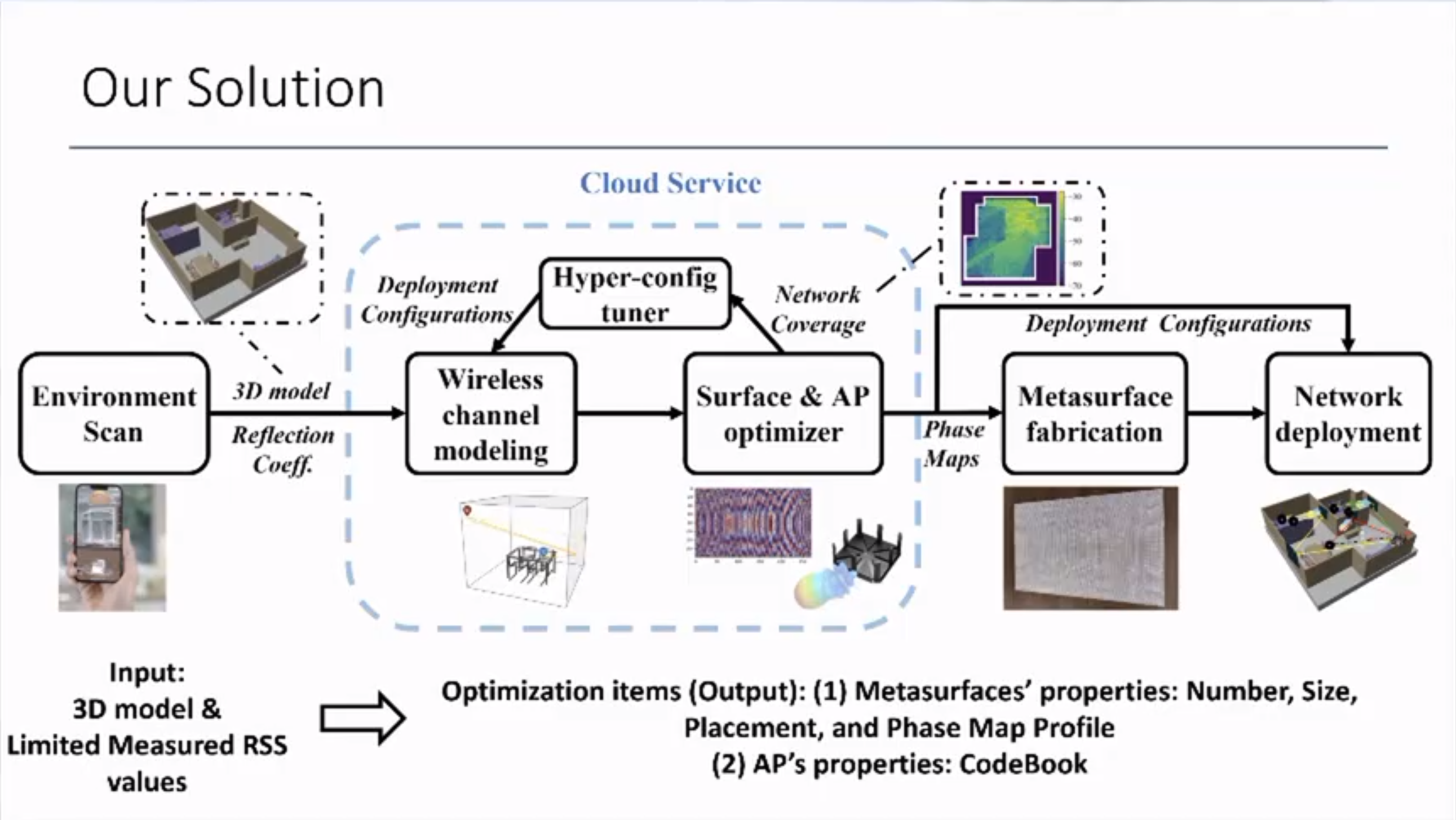 为了解决超表面对环境影响的建模问题,邱教授团队设计了首个支持超表面的光线追踪模拟器,可在3分钟内模拟上百万条波束;为了解决联合优化问题,邱教授团队提出使用梯度下降方法进行迭代优化,以给出最大化信号覆盖率的设计方案,且该方案支持在本地用手机采集环境信息;同时,使用低成本的超表面进行部署。