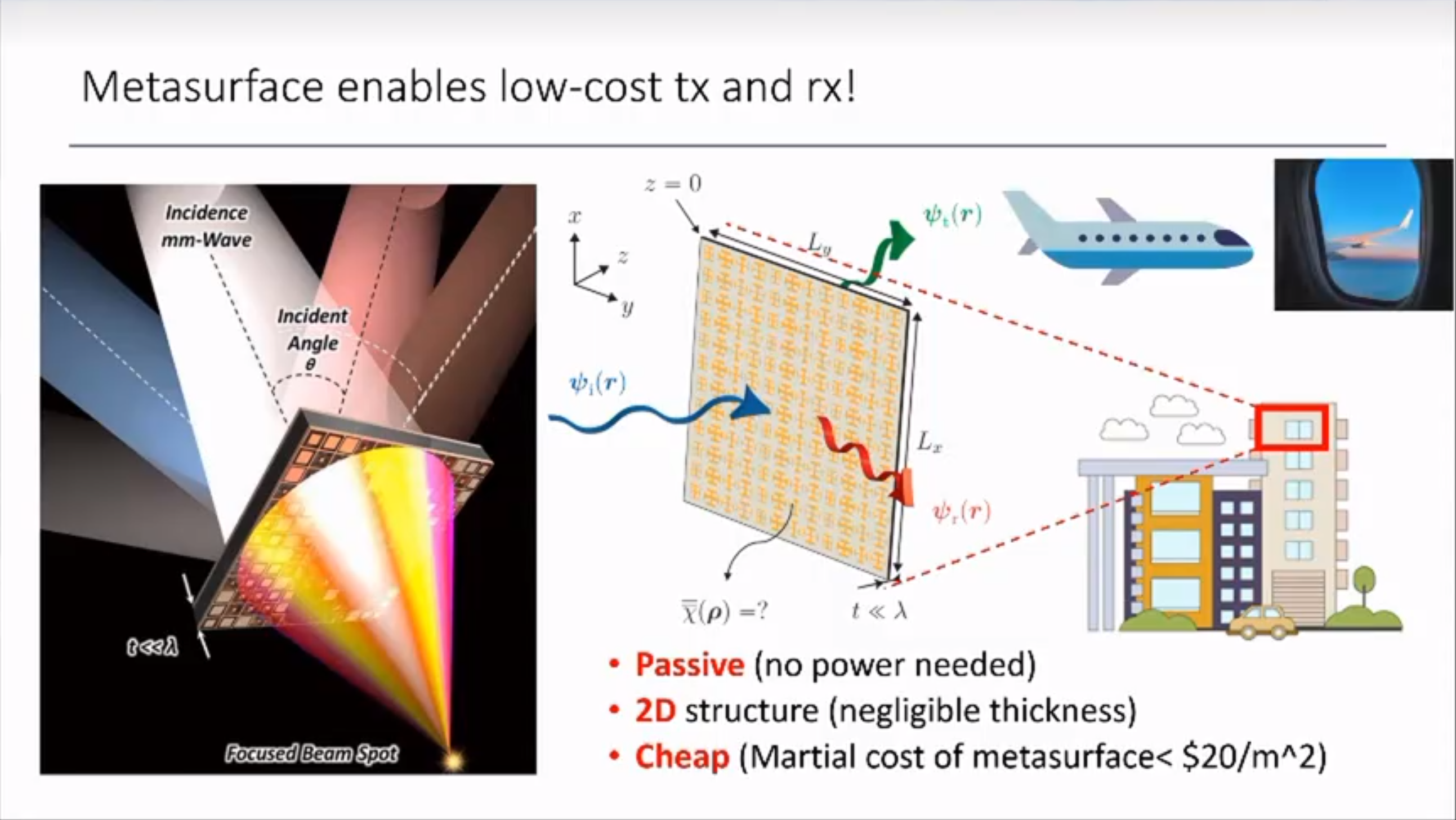 邱教授指出,除了提升天线数目外,改善信道同样能够提高无线传输速率与无线感知分辨率,并且有机会降低额外开销。例如将信号按照规划好的路径进行反射,可以使背对接入点(Access Point, AP)的用户更好地接收到信号,而无需增大发射功率。然而传统材料在反射信号时严格遵循一定的物理规律,如出射角等于入射角,因此在特定环境中可能存在无法到达的盲点。而超表面(Metasurface)作为光学领域近年来的新突破,其基本组成单元可以等效为无源天线,在局部改变信号的相位与幅度,进而在宏观上改变波束的传播行为,如方向控制、聚焦、偏振转换等。通过超表面材料,可以低成本、低功耗地控制无线信号的传输,改善不同环境中的信道条件,实现高效的无线通信与感知。