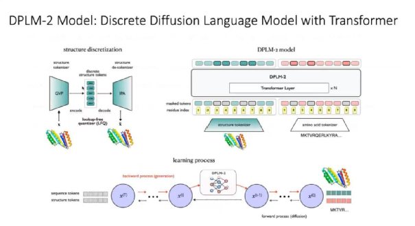 同时,团队还开发了DPLM-2(Diffusion Protein Language Model),用于蛋白质Co-design,即同时建模序列和结构。DPLM-2首先离散化蛋白质3D结构,和蛋白质氨基酸序列构成对。接着使用Transformer模型建模离散扩散过程,学习任意从序列到结构,从结构到序列,从部分结构和序列复原完全结构和序列的建模,从而实现各种蛋白质设计任务,例如给定预期功能,同时生成蛋白质的结构和序列;或者给定序列生成蛋白质3D结构。DPLM使用650M大小的模型就取得超过1.4B大模型(ESM-3)的效果。