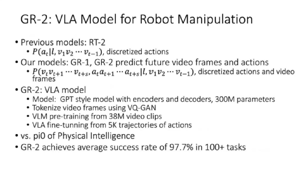 李航博士的团队在学界首次提出GR-2模型,关注点不是未来一个时刻的动作,而是未来几个时刻的动作序列。GR-2首先使用语言和视觉的数据做预训练,以此为基础加上机器人动作序列的轨迹数据和视觉变化做微调,从而对机器人进行行为规划和控制。GR-2对多种任务具有强泛化性,到达90%的准确率。目前核心挑战在于需要采集大量的action数据进行scaling up规模化。