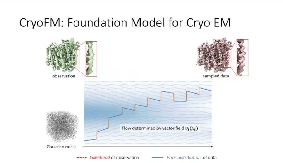 CryoFM是字节跳动研发的冷冻电镜基础模型。冷冻电镜是用于窥探蛋白质动态结构的电子显微技术,能获取蛋白质的2D图像。CryoFM能用于任何冷冻电镜数据处理的任务,将大量2D图像还原为3D动态电影,生成蛋白质3D结构。该模型核心方法是以3D蛋白质动态结构数据为训练数据,使用flow matching技术学习高斯噪声到具体 3D动态结构数据的过程,建模先验分布。对给定的任意冷冻电镜观测数据,通过计算似然函数得到后验分布,以此处理下游任务。对于冷冻电镜数据的各类下游任务,CryoFM是目前最优的方法。
