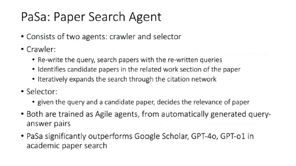 基于Agile端到端的强化学习训练框架,团队开发了论文搜索Agent,PaSa(PAper Search Agent)。PaSa具有两个Agent,分别是Crawler和Selector。Crawler用于重写查询,接着使用重写的查询去搜索论文,不断的找到所有的相关论文。Selector用于比较查询到的论文是否和原始查询论文相关,最后将相关结果返回。PaSa 的论文搜索准确度远远高于传统搜索引擎Google Scholar以及其他大语言模型,包括GPT-4o和GPT-o1。