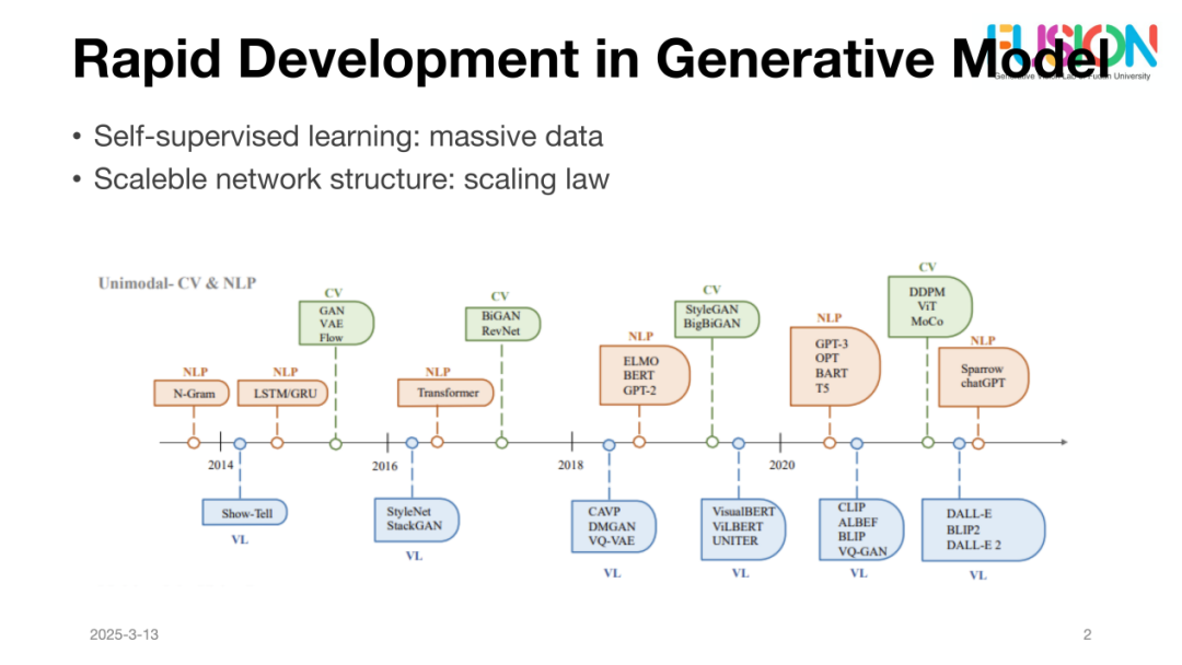 在谈及现有的生成模型时,朱博士首先分析了Diffusion模型在视觉生成中的应用。他指出Diffusion模型的一个关键优势在于其能够通过自监督学习从海量数据中提取深层特征,这使得它在生成高分辨率大尺度数据和细节保持方面表现尤为出色,尤其是在图像和视频的连续性生成上。