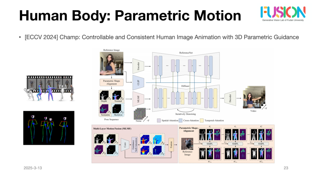 为了应对这些挑战,朱博士分享了他们在ECCV 2024上提出的工作Champ,这项工作通过将SMPL信息和Pose信息作为条件输入,结合UNet模型对生成结果进行对齐,从而改善了视频生成过程中的运动控制问题。尽管该模型仍然存在一些伪影,但相较于以前通过文本描述来控制视频生成的方式,效果已经有了显著的提升。朱博士特别指出,如果能够利用大量高质量的数据,这一方法将能够很好地解决运动控制问题,进一步提高生成结果的质量和稳定性。