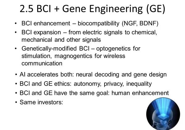 基因工程与脑机接口,就像“分子层面的碳基改造”与“系统层面的功能整合”,二者与 AI 结合,将在未来几十年深刻塑造人类自身。BCI 的发展将不仅限于提升生物相容性(如利用 NGF、BDNF 等促进神经生长),还将从单一的电信号扩展到化学、机械等多模态神经信息的读取与调控;与此同时,基因工程将催生“基因增强型 BCI”,例如通过光遗传学实现更精确的神经刺激,通过磁遗传学实现真正的无线脑-机通信。AI 则在这一进程中双向加速:既推动神经解码能力不断提升,也加速基因电路和分子工具的设计迭代。然而,两者也共同带来对自主性、隐私和社会不平等的新伦理挑战。BCI 与 GE 在本质上都指向同一个目标——人类能力的增强(human enhancement),而推动这些技术的投资者群体高度重叠,预示着这场深刻的技术合流正成为塑造未来人类形态的关键力量。