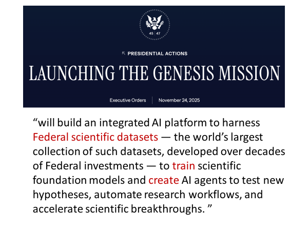 曾教授专门提到了自己最近接触到的一项美国政府最新计划—— “Genesis Mission”,也被形容为一项新的“曼哈顿计划”。该计划的核心思路是:将联邦政府数十年来积累的高质量科学与政策数据(科研项目报告、评估数据、智库研究、政策评估等)通过一个统一的 AI 平台进行整合,用于训练所谓的“Scientific Foundation Models”(科学基础模型),以此来自动生成科学假说、加速科研流程、推动重大科学突破。这意味着:在互联网公共数据即将见底的情况下,美国率先将“封闭的高质量数据”作为新一轮 AI 竞争的战略资源,并以国家工程的方式推进。然而,这些数据对中国及其他国家的研究者未必开放。即使这些数据能够在未来数年里缓解一部分“数据燃料短缺”问题,其本质仍是「人类行为的“外在记录”数据」,且总量有限。曾教授抛出核心问题:即便加上联邦科学数据,AI 的数据瓶颈也只是被往后推了几年——那么,真正意义上的“下一个数据前沿”,在哪里?