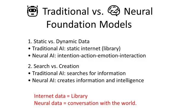 更关键的是,基于神经数据训练的“神经基础模型”与传统基础模型在本质上截然不同。传统 AI 所依赖的是静态的互联网数据,更像一座“静态图书馆”,只是人类行为事后留下的文字、图像和语音记录;而神经 AI 所依赖的是实时、连续的“与世界对话”(Conversation with the World)的过程本身。传统 AI 更擅长检索既有信息,而神经 AI 则面向生成新的信息与智能。例如,当一个人举起水杯、缓解口渴并产生愉悦感时,这些“意图”“情绪”“决策”“感受”都会同步编码在大脑活动之中,神经信号与行为结果、主观体验之间天然存在因果联系,而不仅仅是离线的文本记录。此外,神经数据还具有高度个体化和非同质化的特征。传统大模型训练往往面向“平均用户”,输出趋向“共识化”;而神经数据天生携带个体差异与个性化意图,正是未来打造真正意义上的“个人 AI(Personal AI)”的关键资源。因此,如果说迈向 AGI 必须完成一次“数据范式”的跃迁,那么从互联网数据走向神经数据,很可能就是这条道路上无法回避的必经之路。