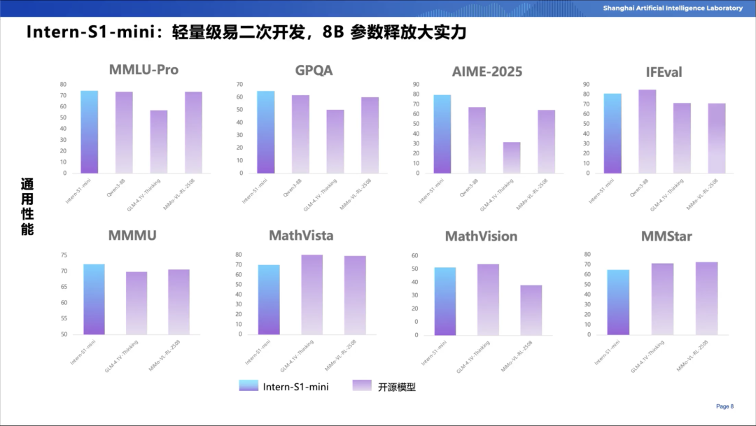 Intern-S1 Mini作为轻量化模型,兼顾开发便利性与科学能力提升,较同量级模型拥有明显优势。