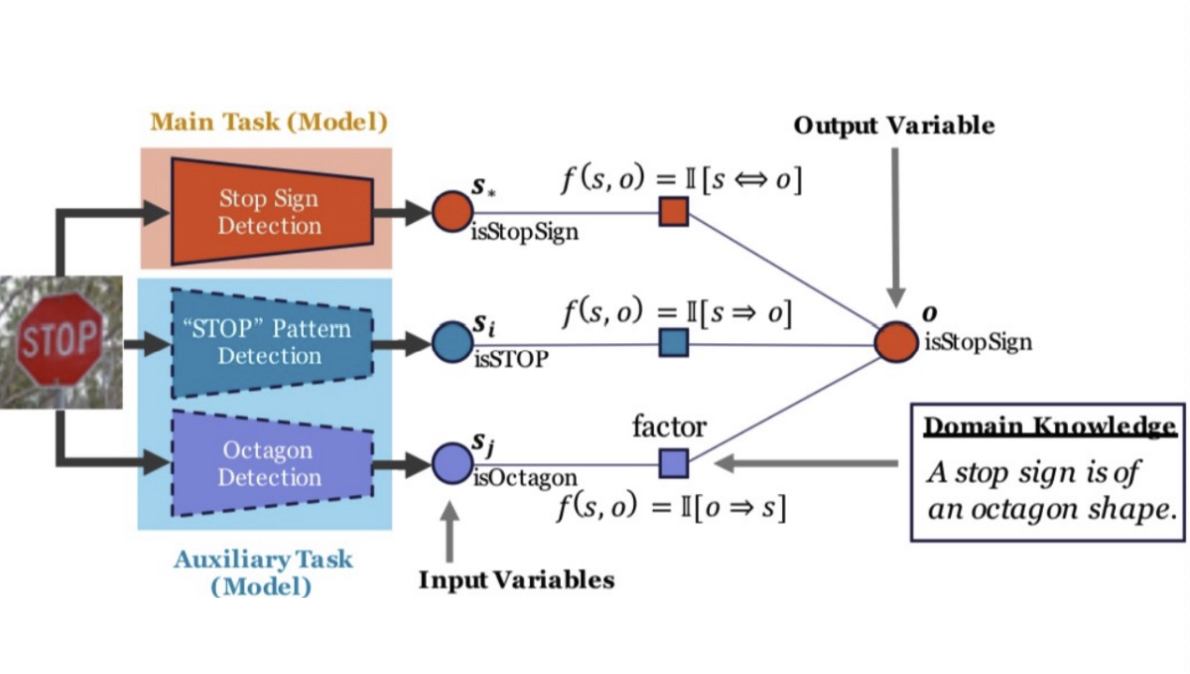 如果将感知-推理机器学习应用到上文中的自动驾驶路边警示牌识别当中。下图中,o代表模型的输出,s代表感知的结果。三个感知模型提取三种特征:对停止标志的识别,此标识是否含有“Stop”字样,以及牌子外形是否是八边形。其中如果识别出“Stop” 标识,则最后结果(o)一定是“Stop”标识。如果识别出“Stop”字样(s),则最后结果(o)也一定是“Stop”标识。如果最后结果(o)是“Stop”标识,则牌子形状一定是八边形(下图:o => s)。实验结果显示应用感知-推理机器学习可以显著提高自动驾驶算法的鲁棒性。